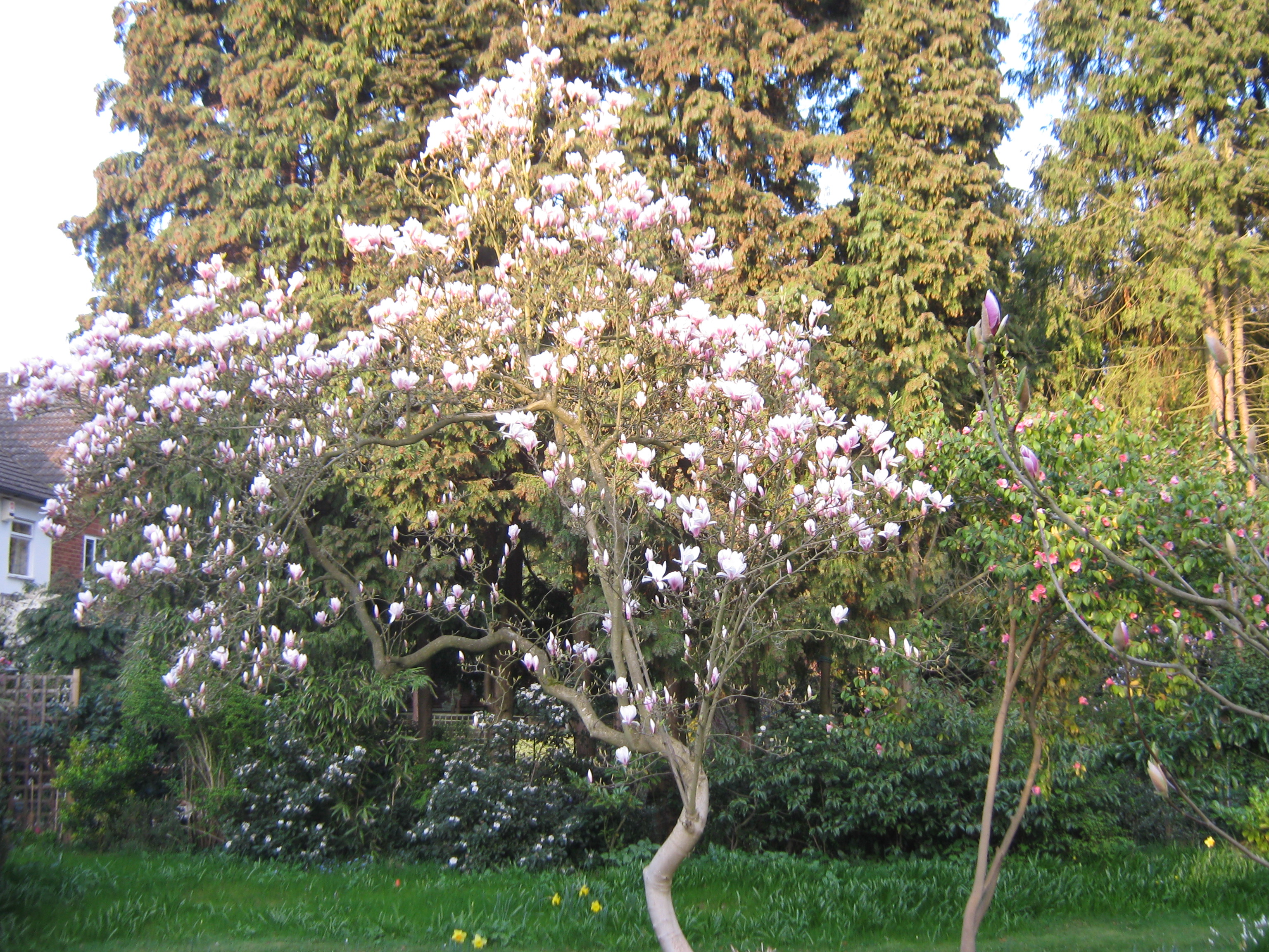 Behind the magnolia is a fairly slender camellia, which is unusual because it flowers from November until April.