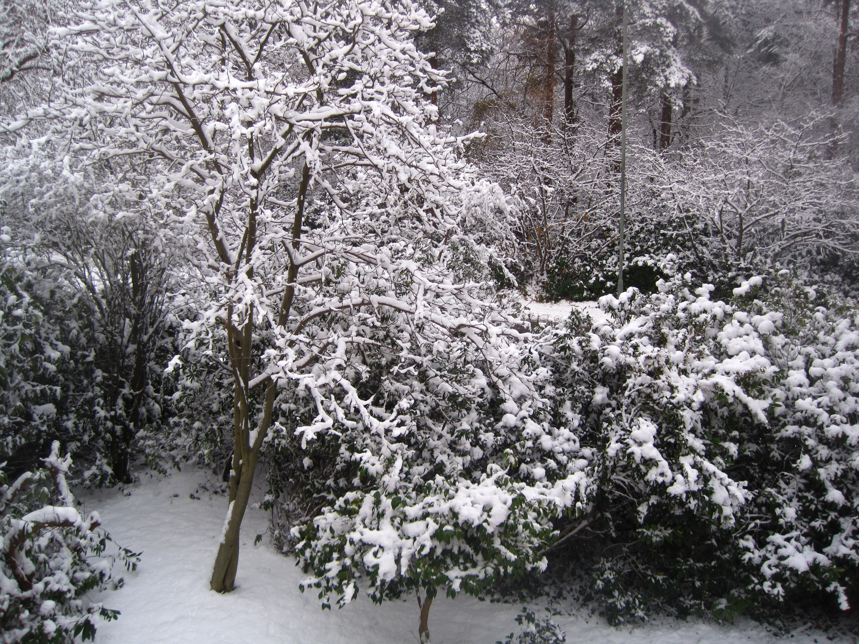 The front garden, with snow-covered rhododendrons and the rowan tree. The trees on the far side of the road back onto a golf course.