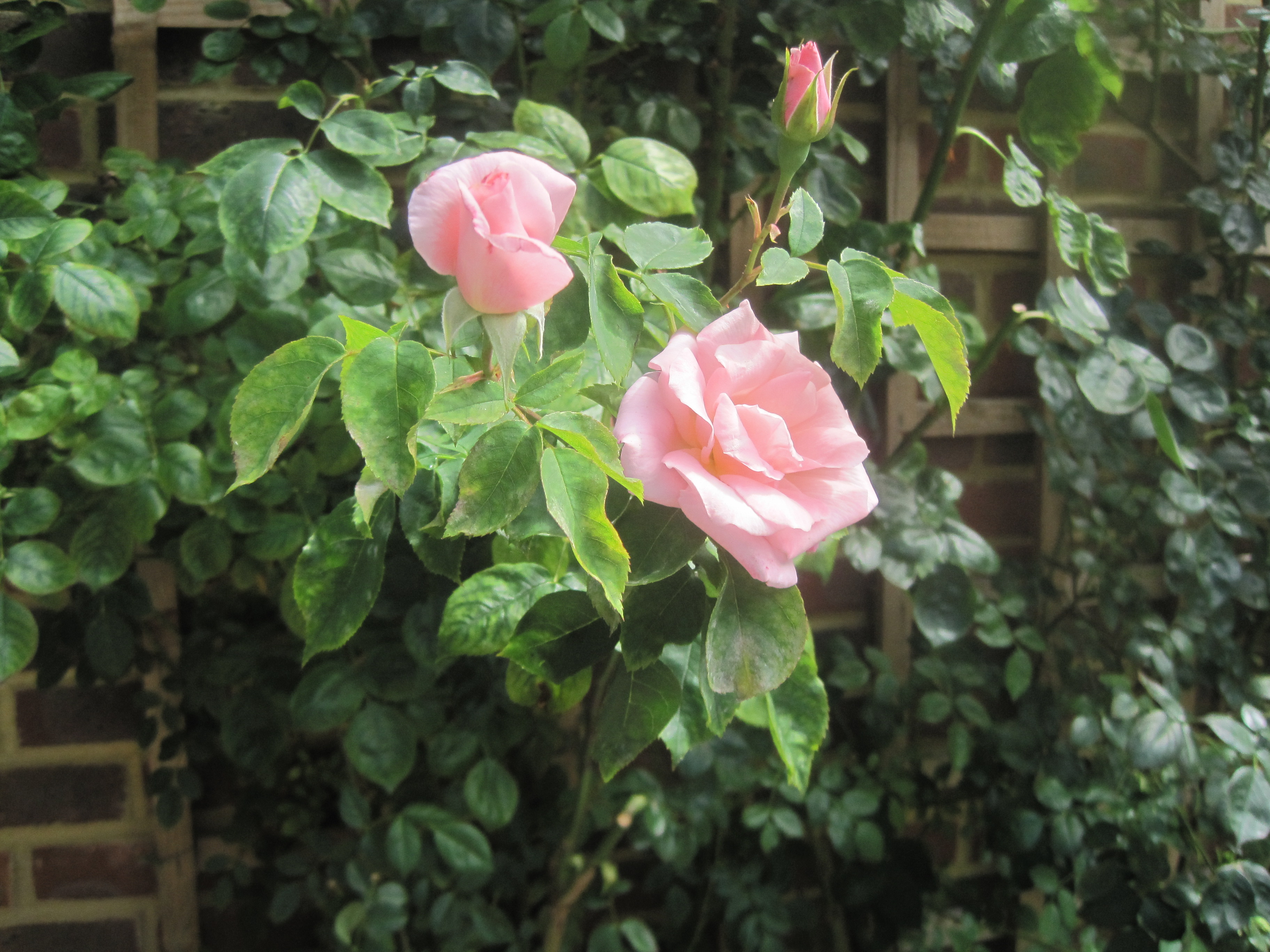 There are two climbing roses next to the kitchen door, a vigorous white one and an even more vigorous pink one.