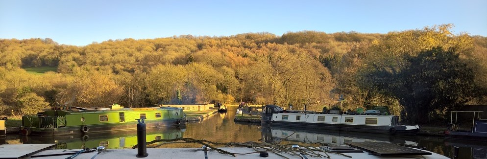 From Bradford-on-Avon the canal runs along the south side of the Avon valley to Avoncliff where it crosses to the north side of valley. Halfway to Avoncliff there is a swingbridge, used by lorries. This is normally left open as there is a normal-height footbridge for the lorry drivers to cross over to open the swingbridge. The towpath is moorable with a gangplank all the way from Bradford-on-Avon Lower Wharf to this swingbridge. After the swingbridge, there are some proper moorings with rings, then there is a small community of people trying to keep some ancient boats afloat. This leads up to the winding hole. After the winding hole, the towpath has a proper stone edge and is moorable with stakes all the way to Avoncliff. Avoncliff Aqueduct from Cross Guns pub garden. 17-01-2019